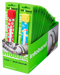 Infoband is a wrist ID, which can be used again and again. You write your phone number on the wrist ID, so if an accident should happen and the child is lost, people can call you and you will be reunited with your child as quickly as possible.
